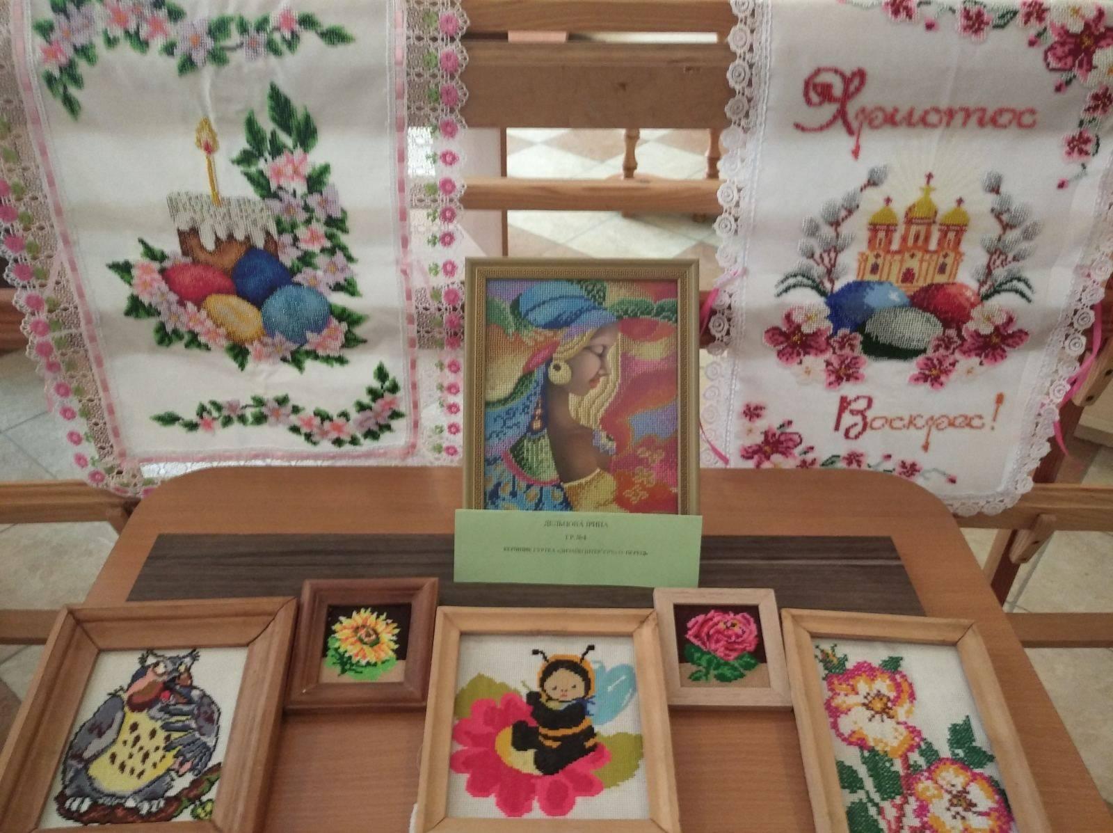 Активну участь в створенні виставки взяли : учениця групи №13 Дубина Іванна( вишиті ікони бісером), учениця групи №4 Серко Іванна (вишиті ікони бісером та викладені декоративним камінням), учениця групи № 4 Дельцова Ірина (вишиті бісером картина та Пасхальні серветки) учениця групи №4 Матьовка Андріанна (вишита гладдю картина), Рябій Аліна учениця групи № 4 (вишитий рушник та вишита бісером ікона).