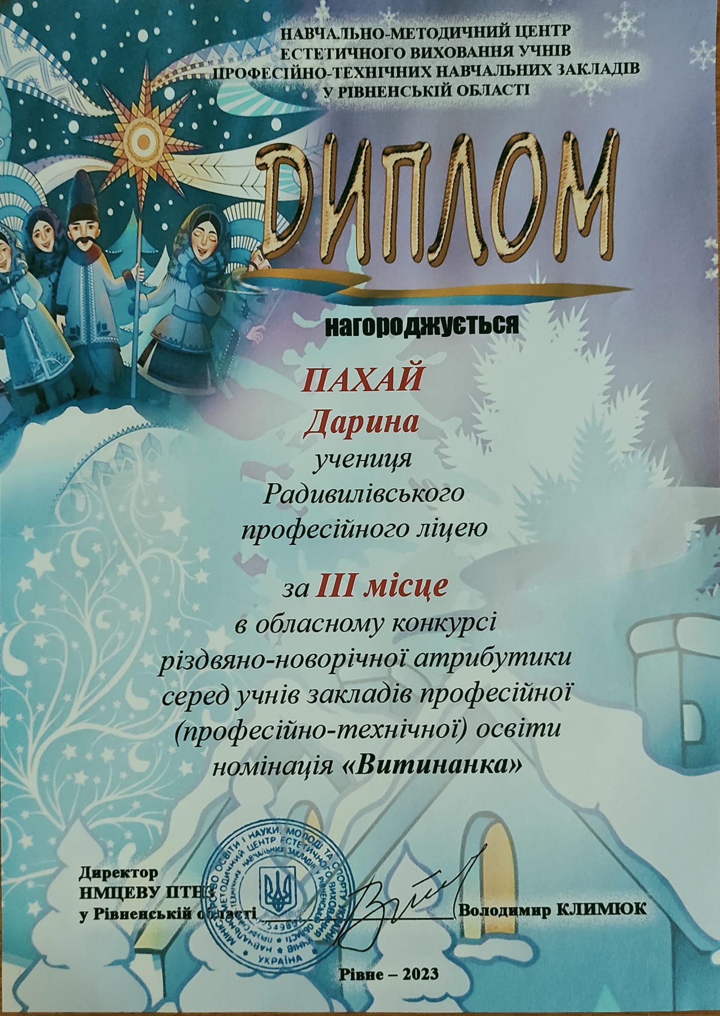 -Пахай Дарина,учениця групи ✓23, -3 місце в номінації “Витинанка”