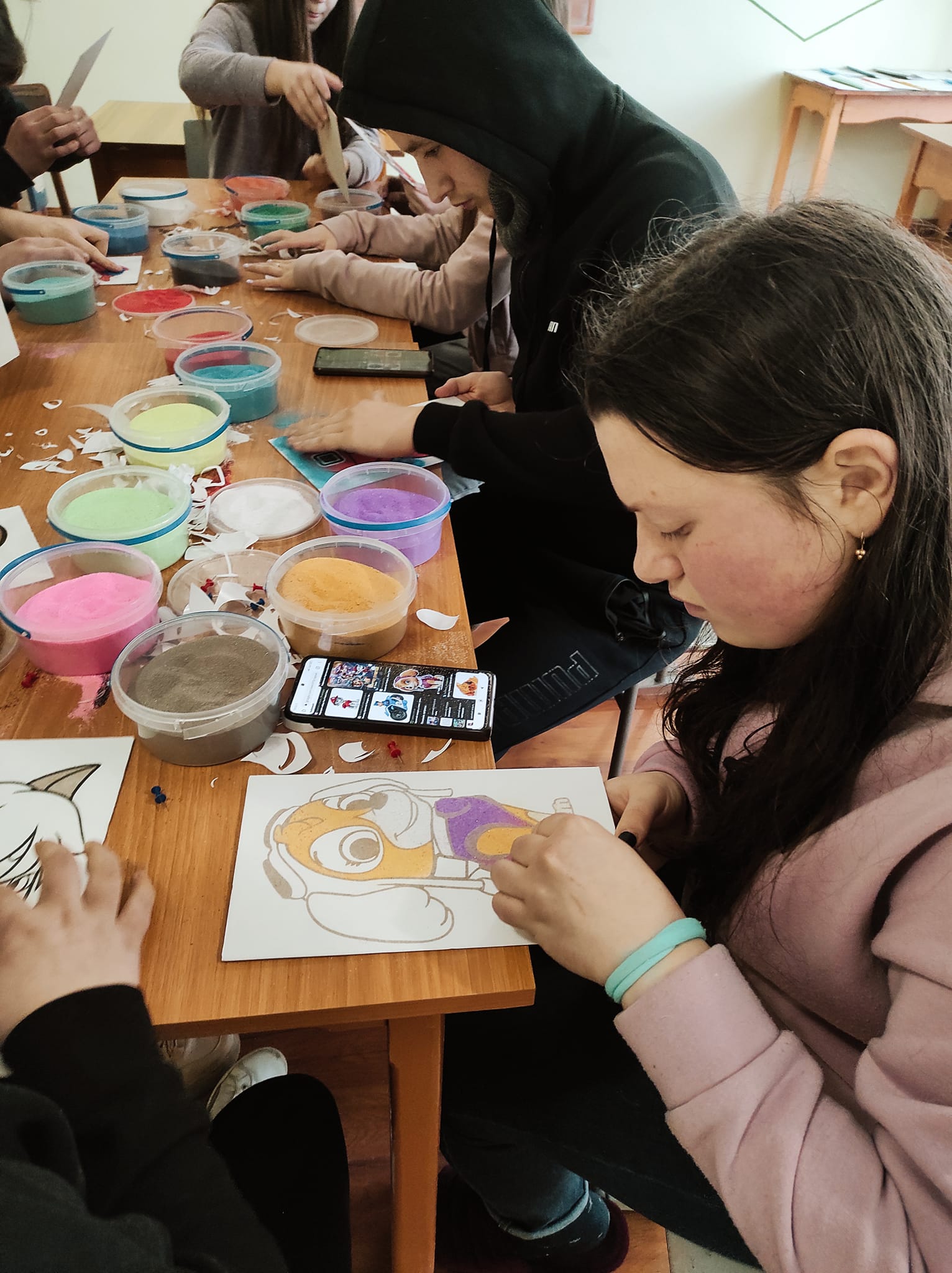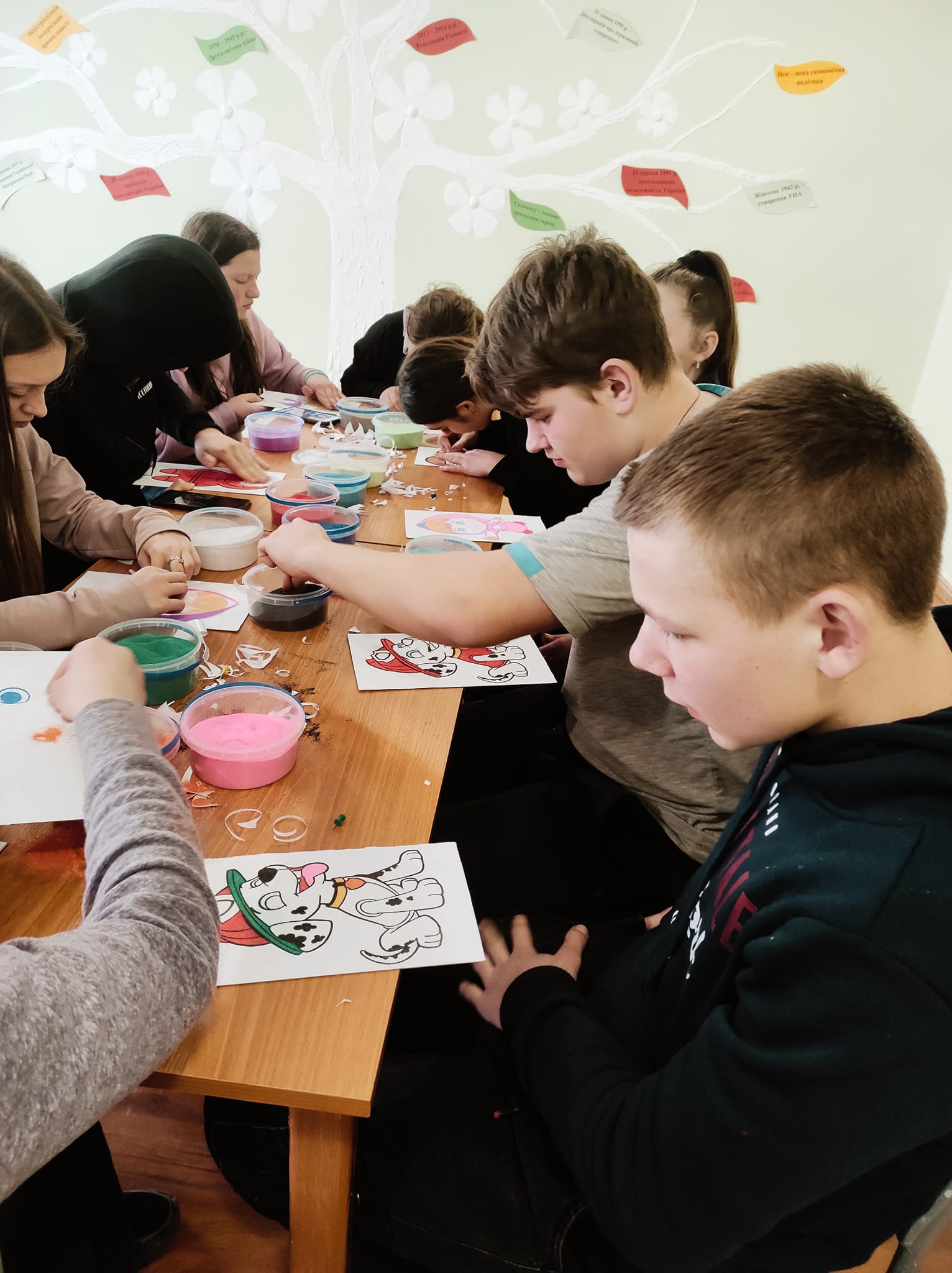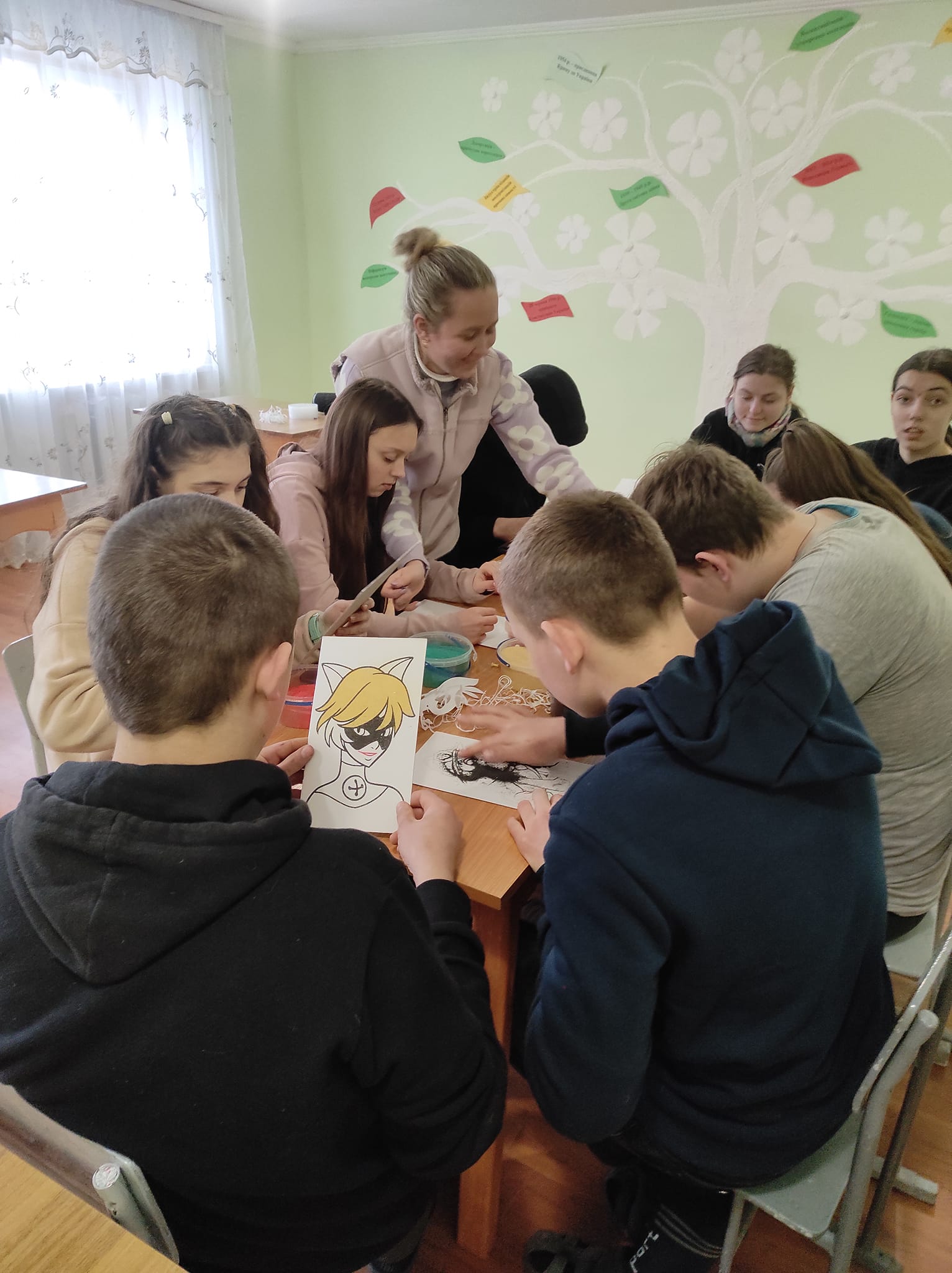 Учні гуртка “Народна творчість”, ознайомлювались з новою технікою виконання робіт та створювали власні картини.